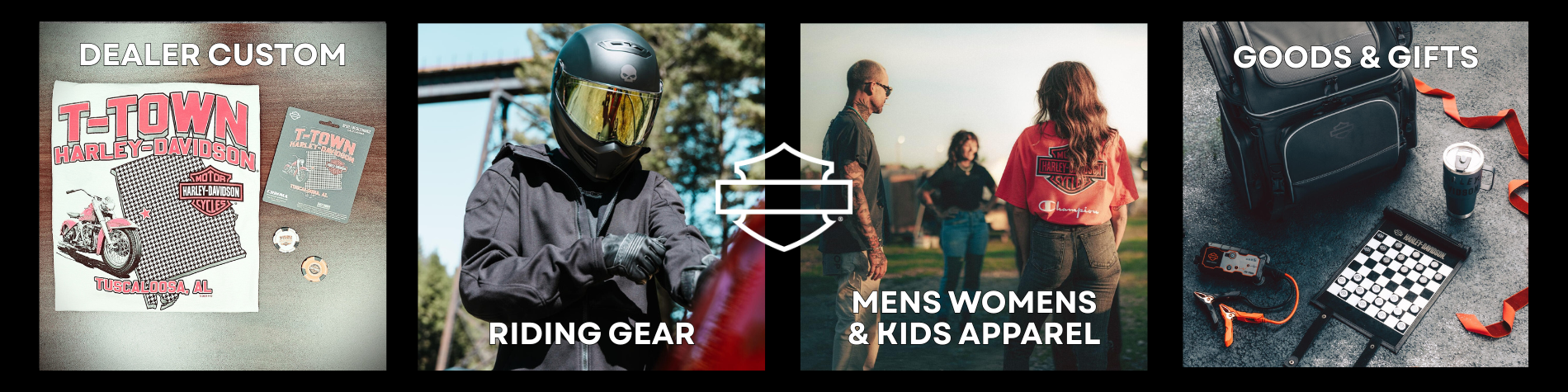 Come in and meet our MotorClothes® merchandise associates. They can assist you when searching for the items you crave. We offer a wide variety of Genuine Harley-Davidson® MotorClothes® merchandise for men, women, and children. Our merchandise is designed especially for guys and gals who love to ride. We also offer a huge selection of MotorClothes® Collectibles. Dealer personalized T-shirts are also available with our T-Town Harley-Davidson® logo. Jewelry, pet accessories, and raingear are just some of the many products we have to offer. We are located just south of Birmingham, AL on Hwy 65, so stop by and see what we have waiting for you.